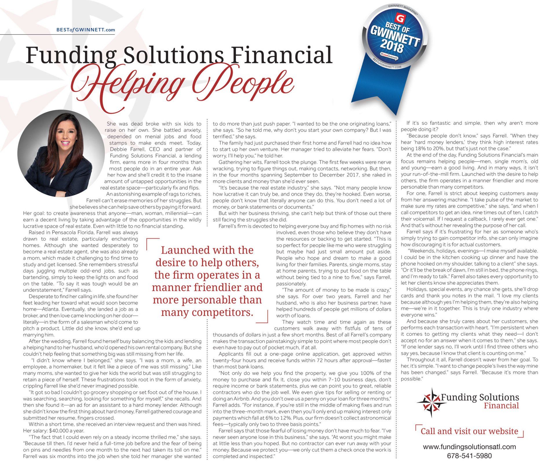 Funding Solutions Financial is a Private Money Lender that opened in 2017. After a year of business, The Farrell's grew Funding Solutions Financial into One of the Best Hard Money Lenders in the Nation and Debbie was announced as #1 Female Lender in the Nation. Since then Funding Solutions Financial grew the business into a Medium Sized Company of over 15 Loan Officers and 3 Processors. We are 100% Customer Service Driven